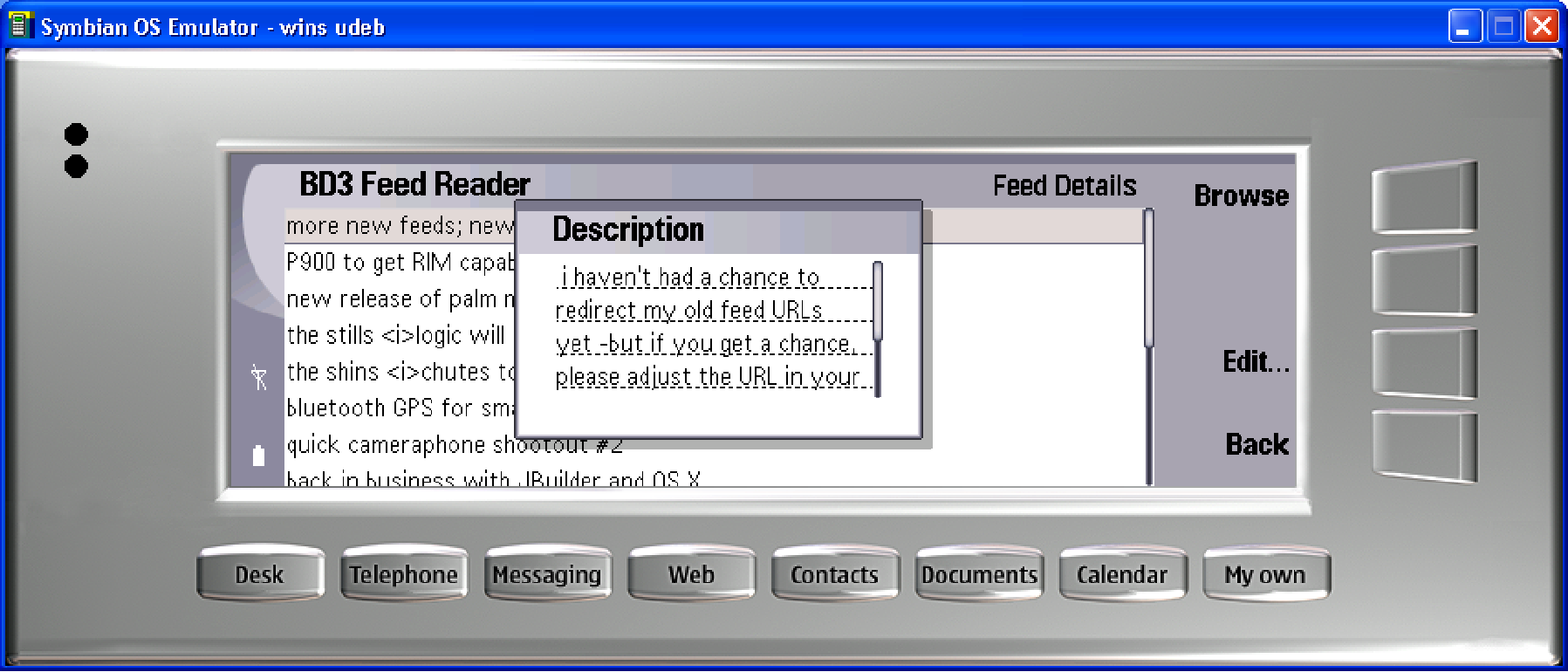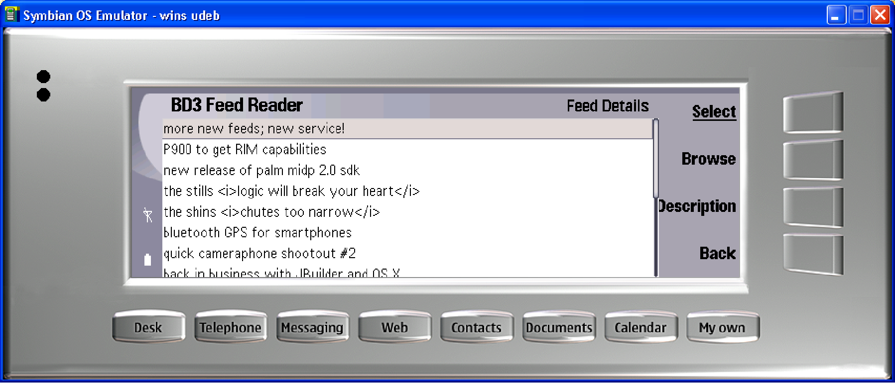 running our MIDP 2.0 RSS Feed Reader unmodified seemed to work fine in the emulator, although I could see re-working some of the presentation for this class of device. for one, this device just begs for color. gotta put that on the list.